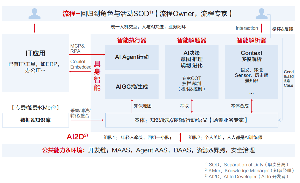 企业在将AI融合业务应用时,以“3R1F”(Revise/优化、Replace/替代、Rebuild/重构、Feedback/反馈)为核心逻辑加速落地。聚焦业务场景,围绕业务对象与逻辑进行本体建模,将场景下的事实数据、业务知识、专家思维链等要素深度串联。在复用已有的IT系统和工具等数字资产基础上,依托本体对知识、数据、逻辑、行动、语义的整合能力,本体支撑融合感知、智能决策、智能行动,形成AI技能嵌入到IT应用中。统一人机入口,回归到流程Owner、业务专家等角色的价值发挥,最终形成业务闭环。与此同时,这一过程还依托开发链、MAAS(模型即服务)、AgentAAS(Agent即服务)、DAAS(数据即服务)以及资源调度、安全治理等公共能力与环境提供底层支撑,让AI能力更高效地与业务场景深度结合。