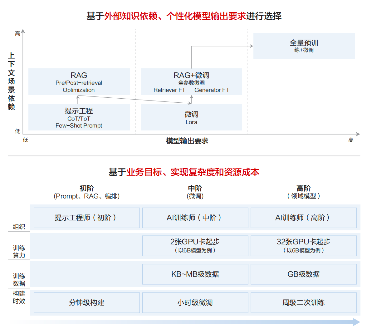 一方面,基于外部知识依赖、个性化模型输出要求进行选择。企业可根据场景对上下文依赖程度和输出定制化程度的高低,选择最匹配的实现路径:从最低要求的提示工程入手,到采用微调与RAG技术,再到适配最高要求的全量预训练结合微调方案,形成阶梯式能力提升路径。