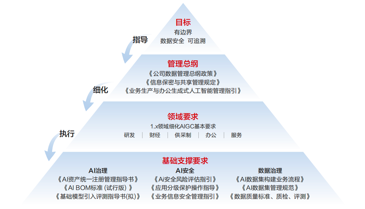在AI的持续运营过程中,治理是一项贯穿始终的核心工作。面对新技术的快速发展,企业应秉持“治理守底线、治理促发展”的原则,通过构建系统化治理体系,确保AI应用的安全性与可持续性。建议建立分层治理架构,从基础支撑要求、领域管控、管理总纲到目标设定形成完整闭环。这四个层面相互衔接、有机结合,既保障治理的全面覆盖,又确保各项措施能够落地见效,为AI应用的健康发展提供坚实保障。在这一过程中,企业还应关注: