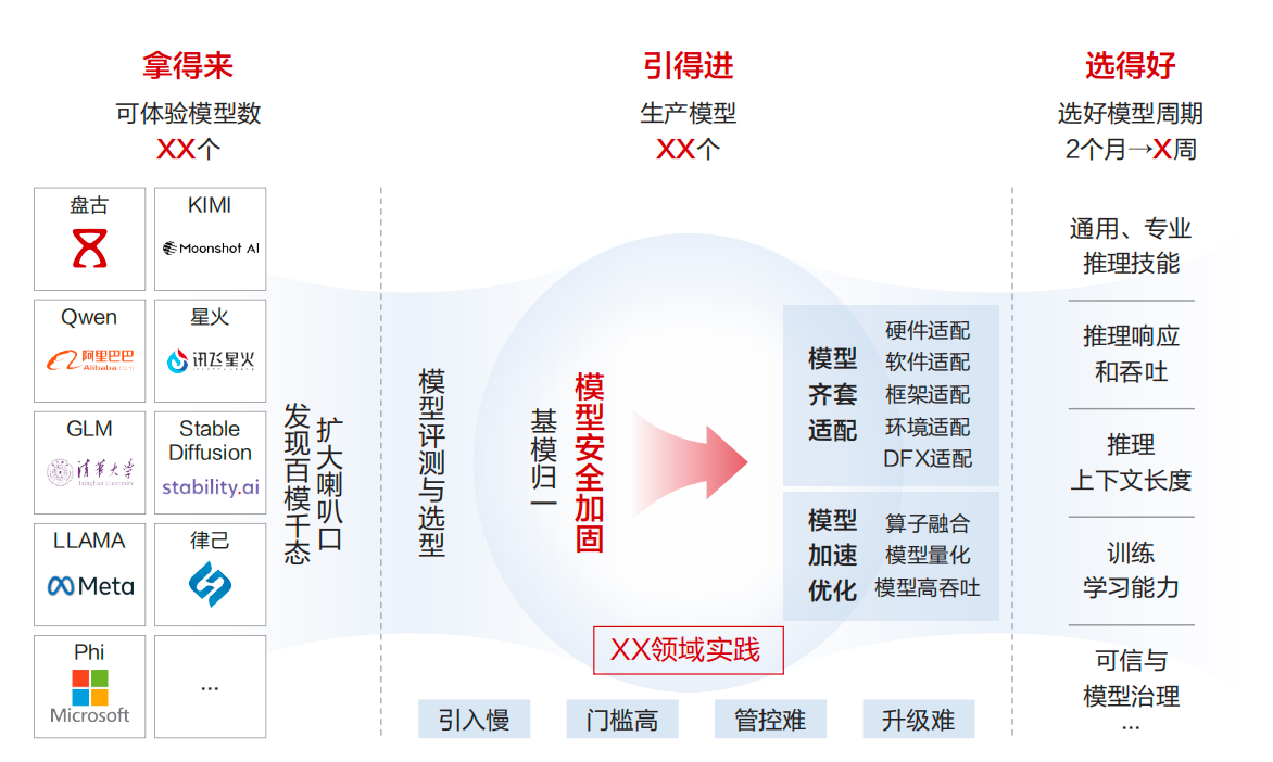 •引得进:重点关注模型在生产环境的适配性。通过严格的模型评测与选型流程,确保模型能在企业现有环境中安全稳定运行,并提前评估引入速度慢、门槛高、管控难、升级难等潜在问题;