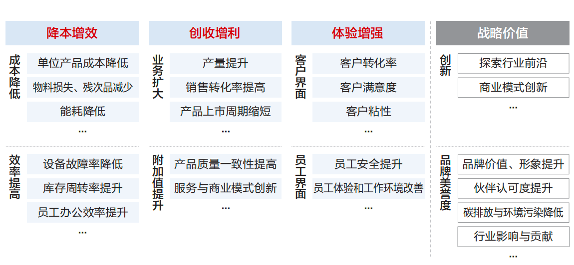 建立目标是数智化转型的第一步,企业只有瞄准靶心才能有的放矢,否则会迷失方向。我们建议企业以投入产出比(ROI)作为核心指标,作为早期投资决策和后期评估的依据。
