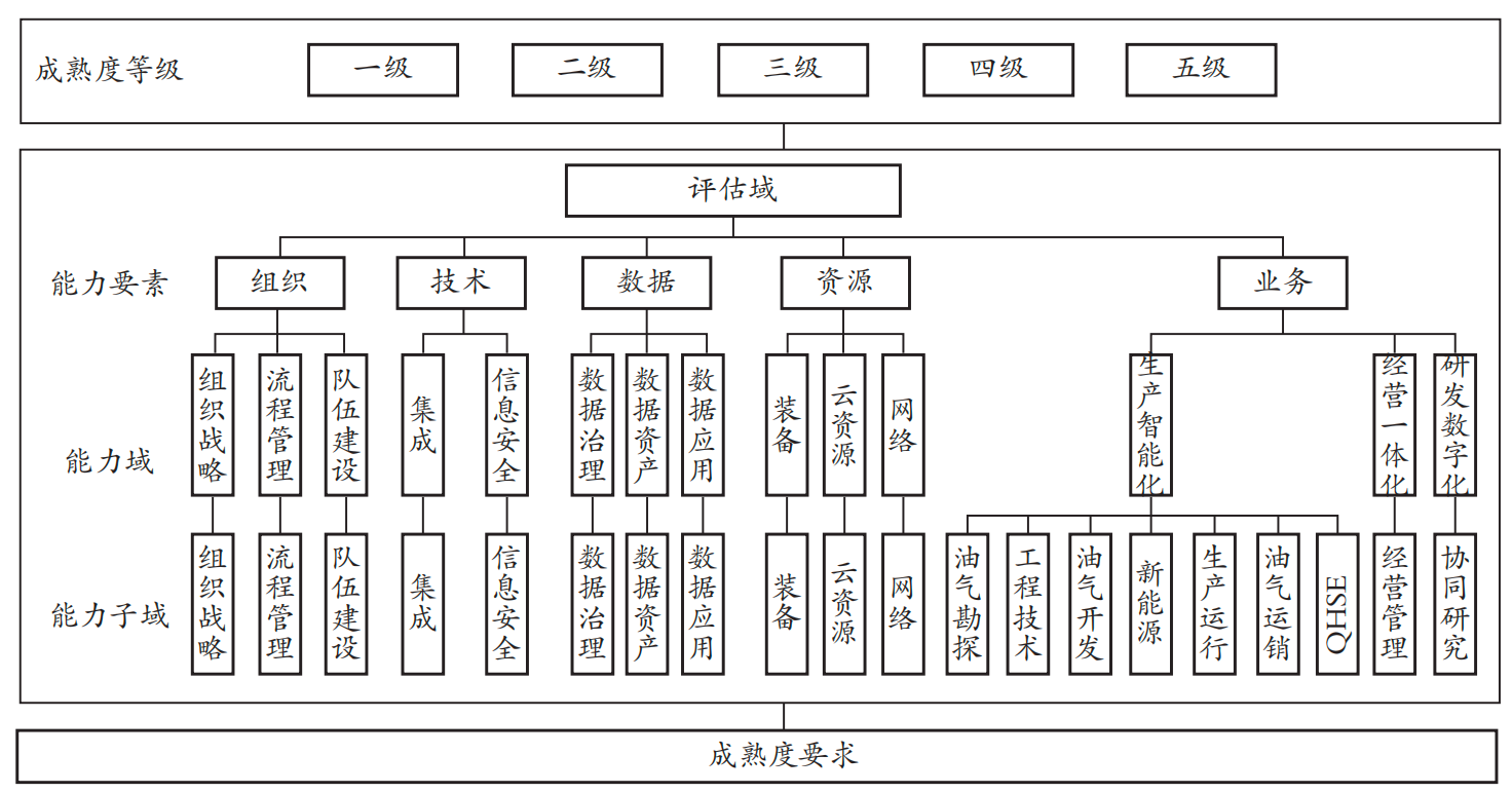 油气田企业数字化转型成熟度评估模型用于衡量企业将数字化技术与资源应用于油气生产各核心环节的能力水平,以系统性提升企业数智化能力。
