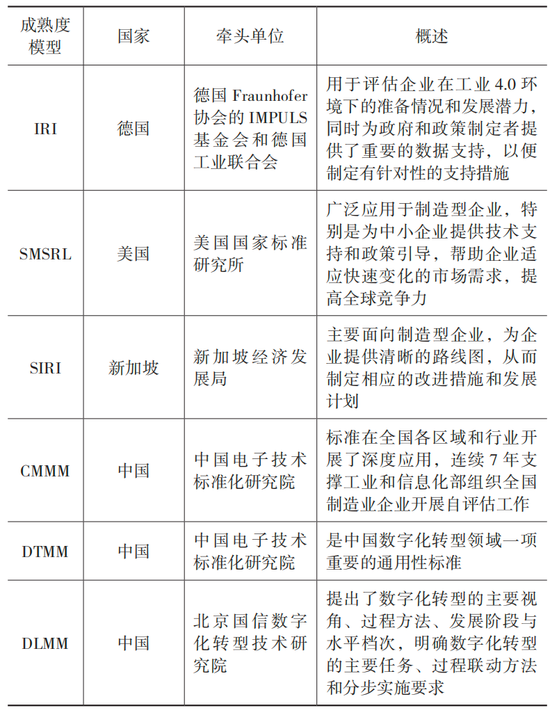 目前,国内外在智能制造、数字化转型领域已发布多种成熟度模型。国际上,德国推出工业4.0 就绪度指数(IRI),美国提出智能制造就绪度水平评估模型(SMSRL),新加坡基于德国框架衍生出智能产业准备指数(SIRI);国内方面,中国电子技术标准化研究院先后发布智能制造能力成熟度模型(CMMM)、信息技术服务数字化转型成熟度模型(DTMM),北京国信数字化转型技术研究院则牵头研制了数字化转型管理参考架构 (DLMM) 等。