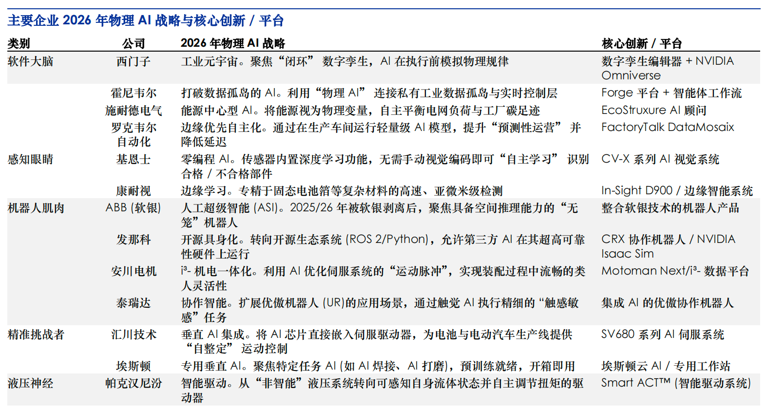 主要企业2026年物理AI战略与核心创新/平台