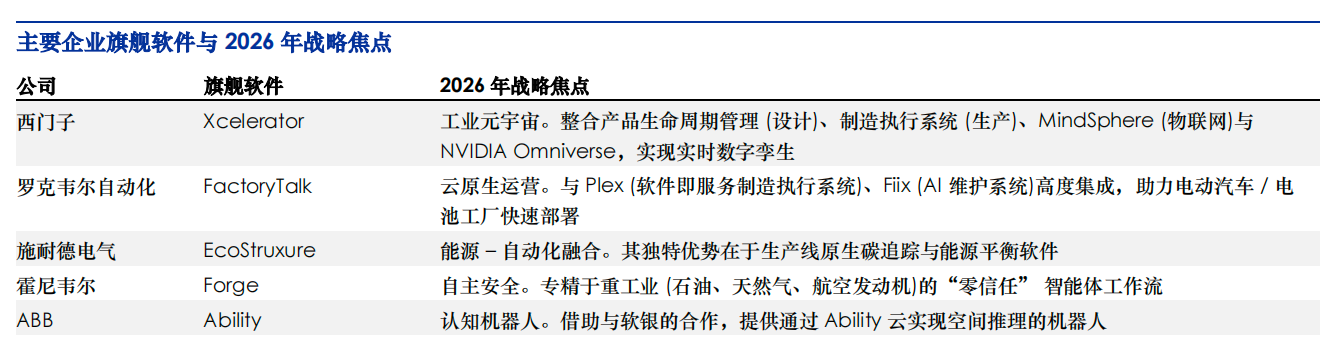 全球制造业头部企业纷纷围绕软件定义制造布局核心旗舰软件,并结合自身技术优势与行业积累,确定了2026年的核心战略焦点,各企业差异化的布局方向,也勾勒出软件定义制造的不同发展路径,成为行业发展的重要风向标。