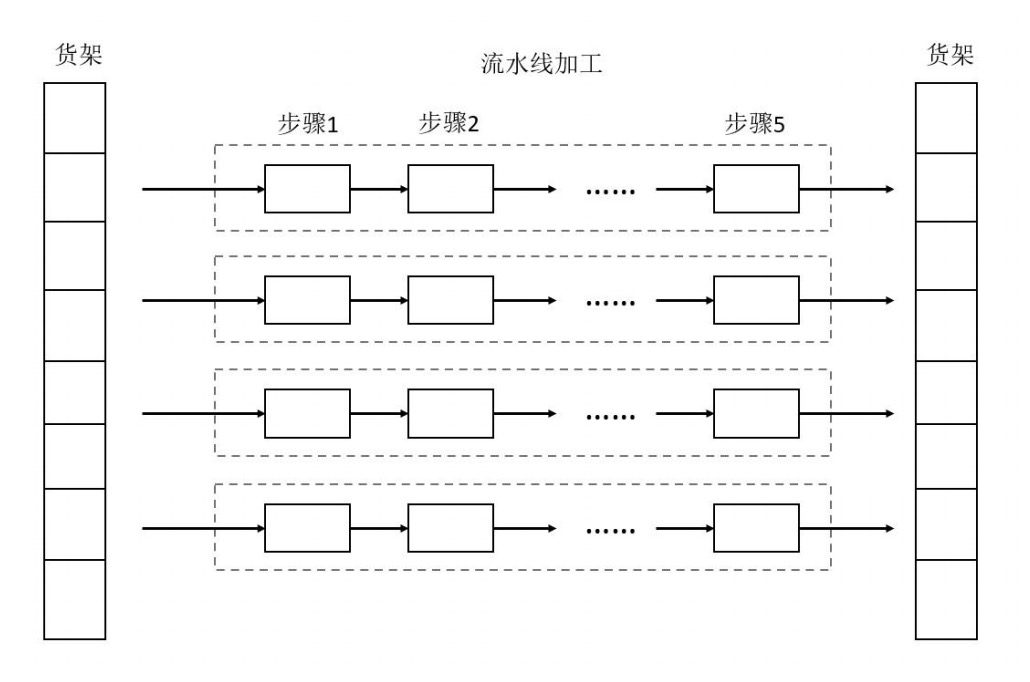 该种方法面临机器故障导致整条流水线进度拖慢、效率降低的风险,如果运转小车可以在不同流水线之间穿插,那么就可以自行选定下一步的加工位置,避免空闲机器利用率低下,缓解单一路线拥堵的情况,提高加工效率。
