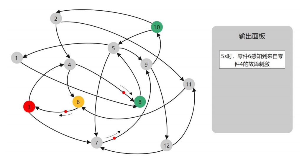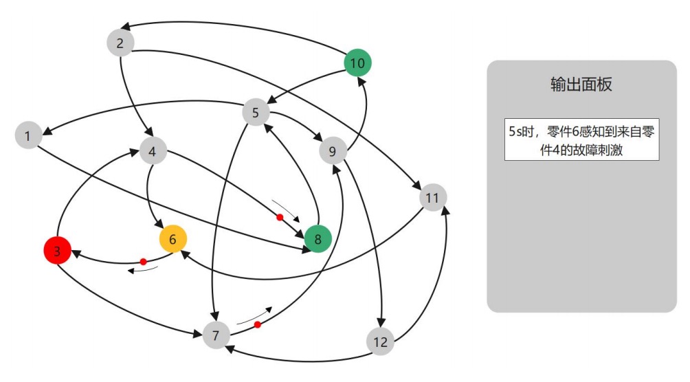 (3)随着故障的传递,传感器状态变化并输出故障方向与时间戳。在此例子中,零件 6、