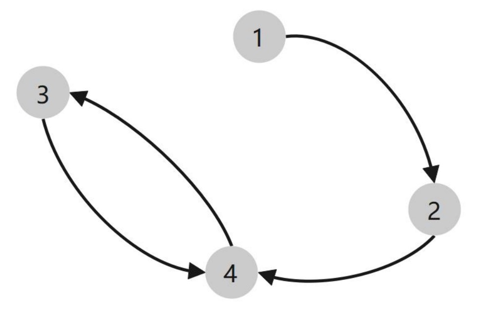 对于一个特定的复杂装备,可以构建该装备的零件体系网络,该网络是一个有向图。在复杂装备的零件体系网络中,每个节点代表一个零件,节点之间的有向边代表零件之间的影响关系。以下图为例,零件 1、零件 2、零件 3、零件 4 的故障分别会传递至零件 2、零件 4、零件4、零件 3。