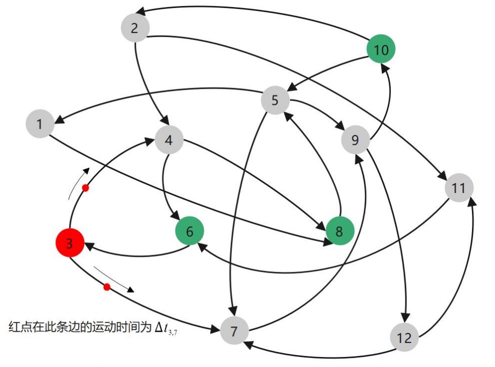 在零件体系网络中,灰色节点代表未经任何处理的零件,有向边表示零件之间的故障传递关系。绿色节点表示放置的传感器的零件,红色节点表示出现故障的零件,有向边上运动的红色点表示故障在零件之间的传递过程,传递时长为Δtij。