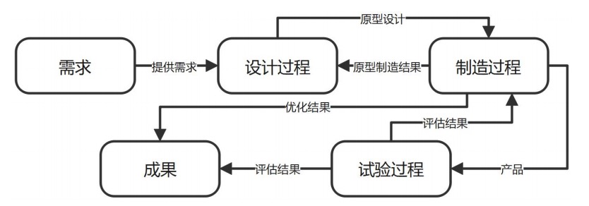 由研发部门根据产品方向进行需求可行性分析,并提出技术方案,技术方案包含装备要实现哪些功能、具体实现功能的程度;设计部门根据技术方案进行初步设计并生成设计图纸,图纸涵盖了装备各个零部件几何尺寸特征和材料特征。图纸经过工艺部门、质量控制部门和工程部门联合审核,确保制造工艺可行、图纸符合质量标准、能够通过结构性能测试。此过程全部为理论论证,被审核主体为设计图纸,而非装备原型实物。经过审核的图纸才能作为装备原型的生产图纸,否则图纸将返回设计部门进行修改完善。经过审核通过的图纸,作为设计图纸原型交由制造部门,制造部门根据图纸进行产品原型的制造,产品原型制造为小规模试生产,只生产用于测试实验的产品原型。产品原型交由测试部门进行性能测试,性能测试效果作为反馈信息交由设计部门进行产品细节优化,研发部门在此过程中提供技术支撑,由设计部门形成详细设计图纸。