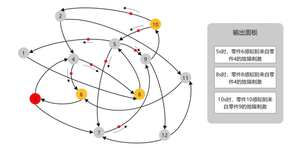 零件 8、零件 10 的传感器依次感知到故障,如图 24 所示,输出面板展示出它们接收到故障信号的时间以及故障的来源方向。