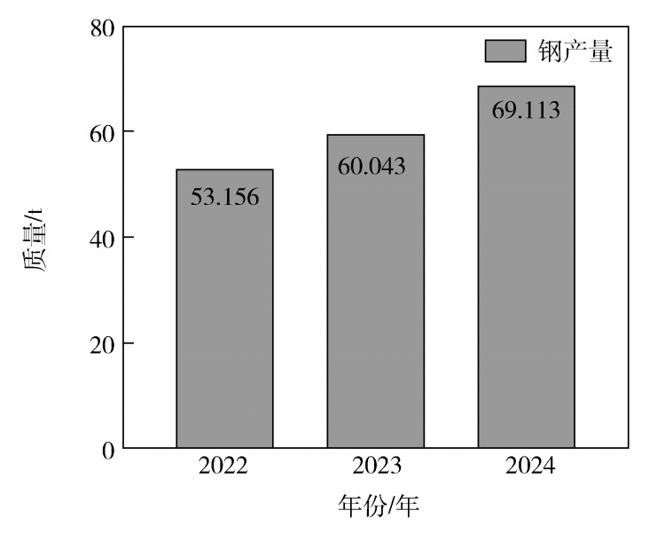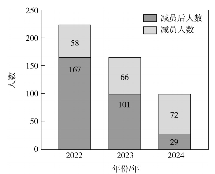 图5、图6所示为2022—2024年石钢精整工序的减员和产能情况。原3条精整产线共有225名操作人员,3年间分别减员58、66、72人,而产能逐年提升。相对于应用智能装备集群前,精整工序所需操作人员共减少69.28%,同时将精整工序的产能提升30.02%,该结果表明智能装备集群在精整工序中具有显著成效。