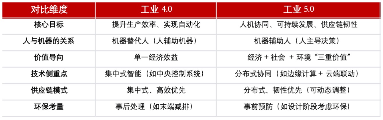 很多人会问:工业 5.0 来了,工业 4.0 是不是就过时了?其实不是。我做了个对比表,大家一看就明白: