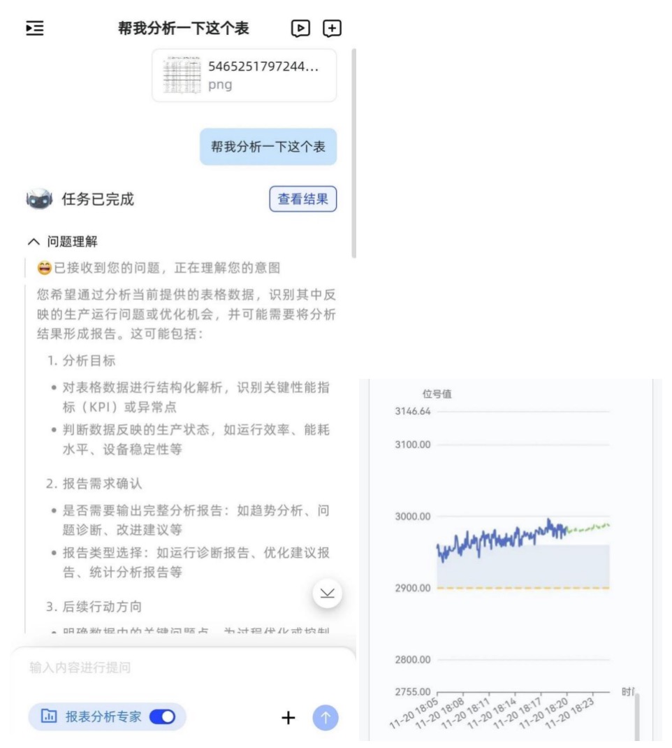 发布会现场的演示让全场惊呼:工程师现场提问“识别低甲酸性气流量最近的异常”,TPT秒级拆解问题,自动调用模型和数据,不仅给出了异常分析报告,还生成了可直接执行的智能体;另一个演示更绝,对着生产报表拍张照,不到一分钟,APP就完成了数据提取、格式规整,还自动生成了趋势曲线,把原本几小时的人工活儿压缩到分钟级,准确率高达90%以上。