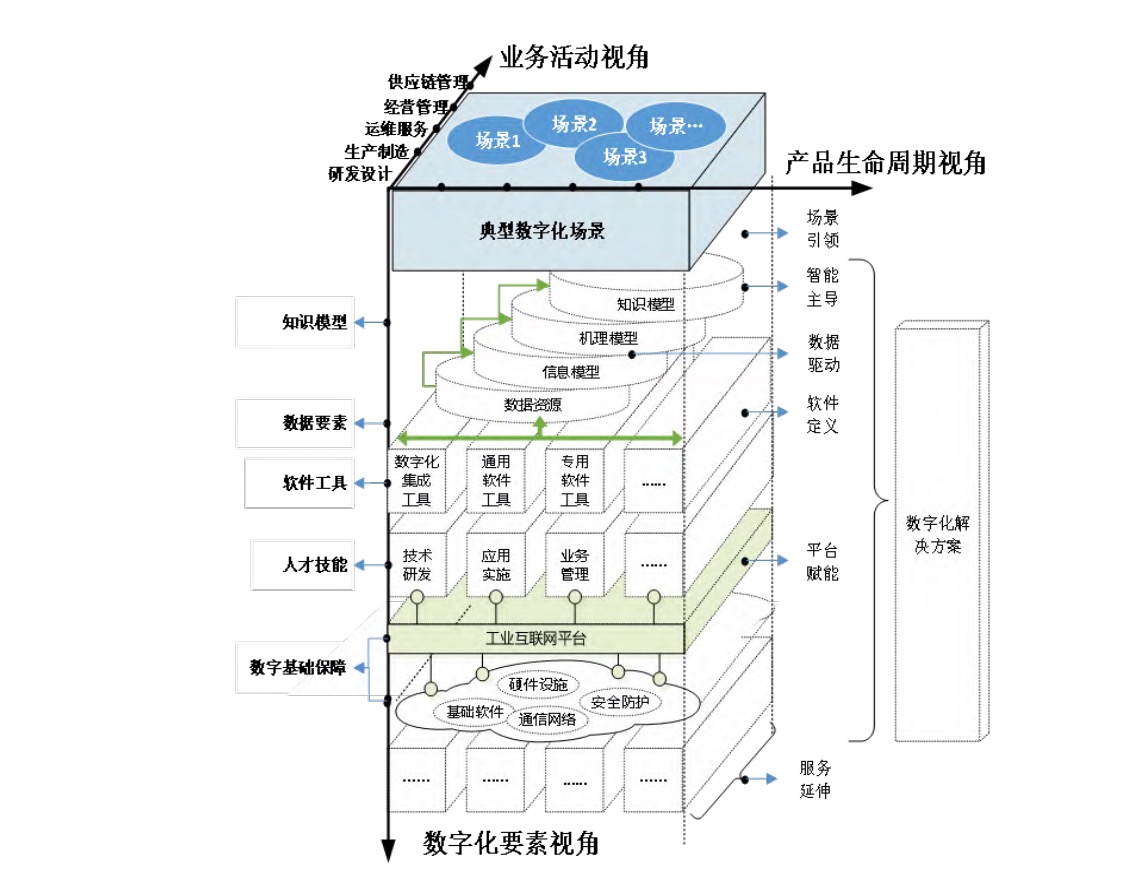 参考上述国际通行参考架构的组成元素和构建方式,将场景从企业业务流程、从产业链关键环节中拆解出来,从业务活动、产品生命周期、数字化要素三个视角出发,系统描绘场景数字化转型的要素组成、要素关联以及协同关系(图3)。