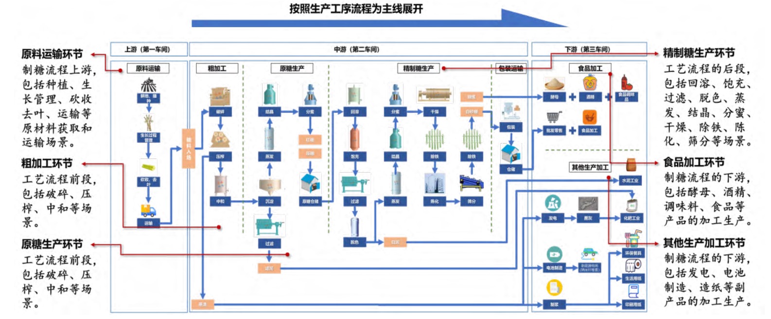 流程行业结构示意图主要按照产品的生产流程展开。如制糖行业(图5)工艺流程的前段主要为原材料采集、运输、粗加工等,为炼制糖准备原材料;工艺流程后段为原糖和精制糖生产;行业下游为糖的食品加工以及制糖附属产物的再利用。