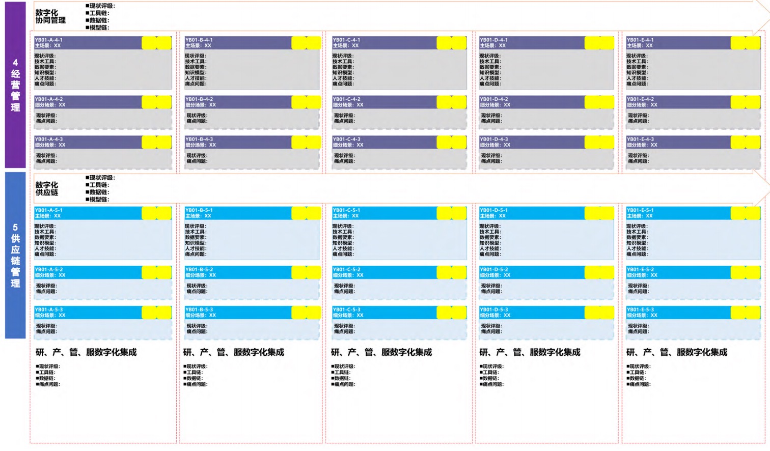 行业场景图谱由一条横向贯通关键环节的主线和纵向覆盖研发设计、生产制造、运维服务、经营管理、供应链管理五类业务活动的区域构成。各类数字化转型典型场景按照所处的关键环节位置、业务活动类型在图谱中进行有序排布。其中,横向和纵向分别对跨业务活动、跨环节的协同类场景进行描述(图6)。每个场景由场景唯一标识、场景名称、场景现状评级、场景转型价值标签四类数字化要素及场景痛点组成,以标准化的方式对所有场景进行描述和表达。