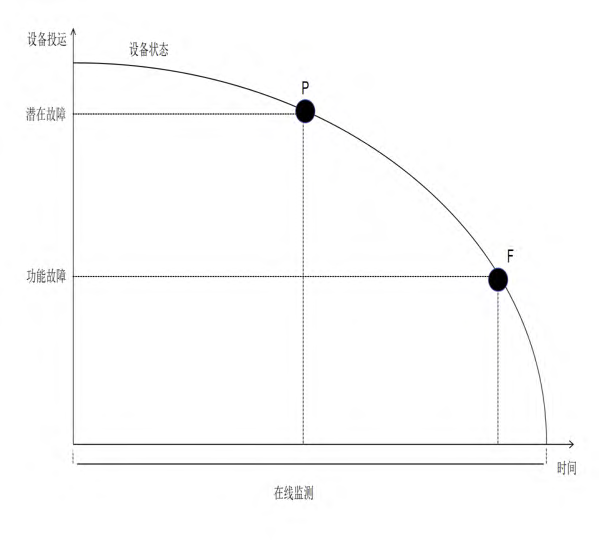 预知维修是以设备运行状态为依据的维修。它是对设备主要部位进行定期(或连续)的状态监测和故障诊断,判定设备所处的状态,预测设备状态未来的发展趋势,并依据设备的状态发展趋势和可能的故障模式,预先制定预测性维护计划,确定设备应该修理的时间、内容、方式、需要的技术和物资支持的维修模式。流程行业中的设备从潜在故障到功能故障具有一个周期,图4是设备全生命周期P-F曲线,通过这种故障预测方法,可以在曲线的P与F之间选择合适时机将设备故障排除,实现装置稳定运行,大幅度降低生产安全风险。