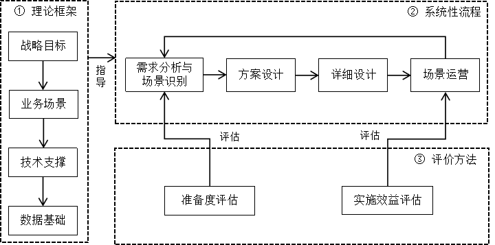 基于场景设计的基本原则和具体内容的论述,本文提出了一个智能化场景设计框架,如图1所示,主要包含理论框架、系统性流程和评价方法三个部分。通过从企业战略目标、业务需求出发直至数据基础的“纵向设计”,以及涵盖操作流程和评价方法的“横向设计”,确保业务场景化的落地应用可以精准服务于企业价值的创造。