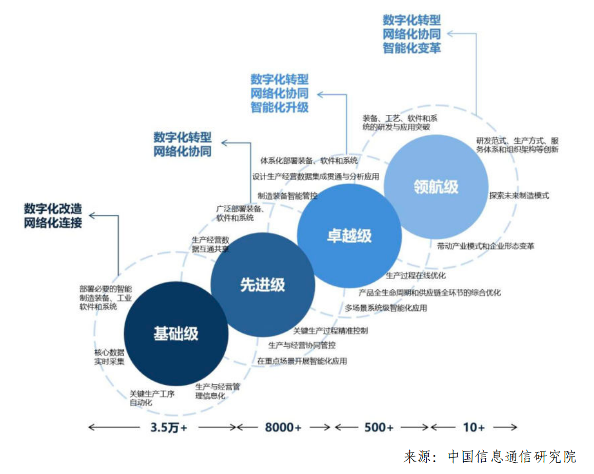 一是全面推广加速,未来五年基础级、先进级智能工厂将实现规上工业企业数字化转型基本普及,卓越级、领航级智能工厂将推动全生命周期集成互通,高价值成熟场景全面推广;