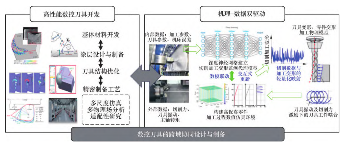 支撑上述跨域协同的关键所在是运用物理机理与多源数据融合双向驱动。其中,物理机理模型是基于材料微观组织本构、热力载荷演变以及切削动力学特性等方面来进行构建的,从而保证研发系统具备科学依据以及可解释性;与此同时,凭借融合试验观测、数值仿真和生产现场所产生的多源异构数据,并运用深度学习去功能提取工艺链中的非线性特征,便可弥补单纯依靠机理模型在极端服役条件下的表征能力局限。由二者协同构建的智能研发系统打通了材料设计、刀具制造以及行业应用之间的信息壁垒,使得刀具研发从以往依赖经验转变成为基于数字孪生的正向预测设计,为高端制造过程的精准管控提供了数字化基础。