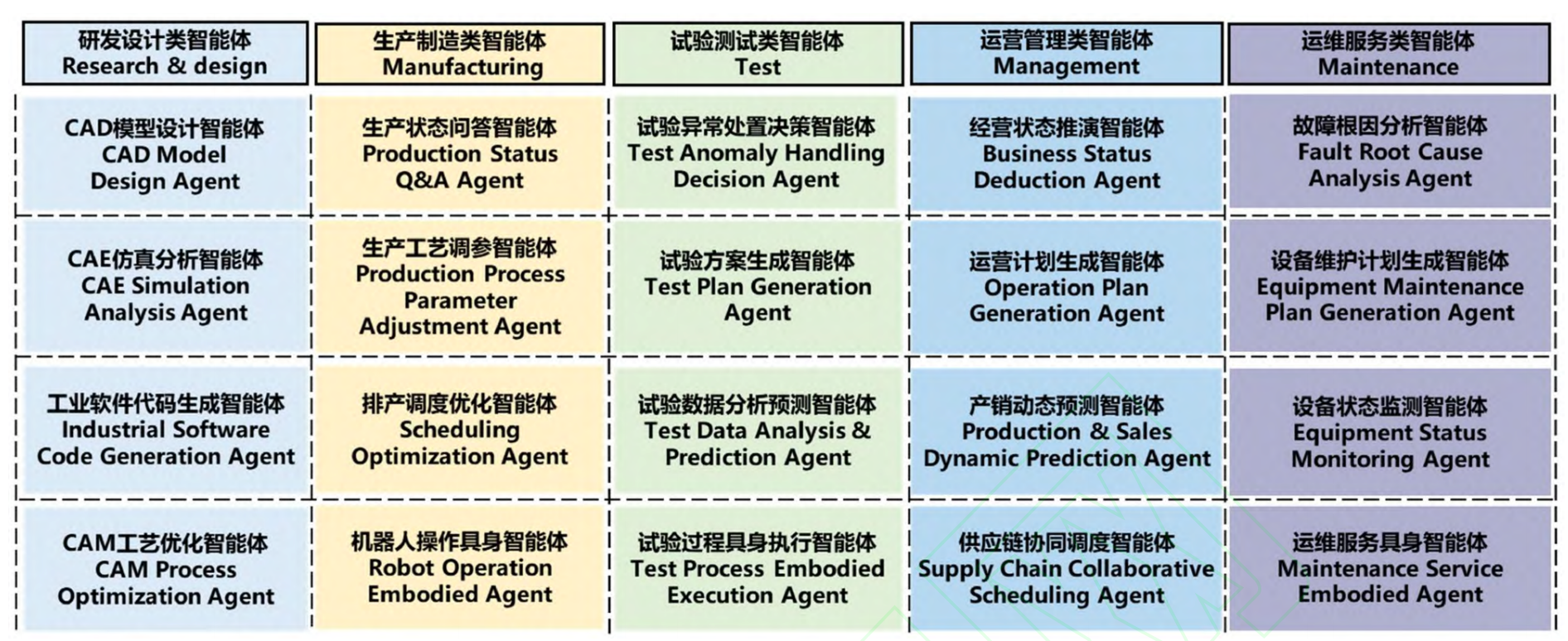 运维服务环节的工业智能体可用于产品的远程服务, 例如装备全生命周期健康保障, 监测状态, 预测劣化趋势, 制定维修策略, 替代传统被动响应模式. 可形成故障根因分析智能体、设备维护计划生成智能体、设备状态监测智能体、运维服务具身智能体等. 推动运维模式向主动预测转型, 保障设备稳定运行, 降低运维成本与停机损失, 实现产品与装备全生命周期高效管理.