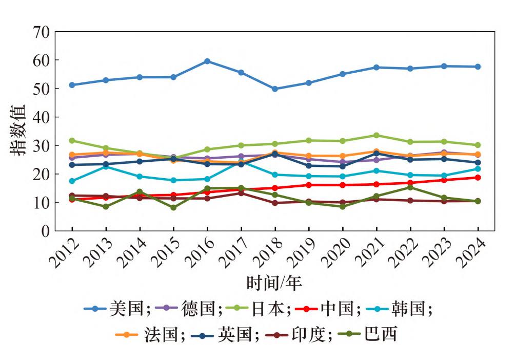 2012-2024年,印度制造强国发展指数由42.75提升至49.05,上涨6.3;巴西制造强国发展指数由36.43下降至29.24,下跌7.19,降幅居九国之首,两国整体发展差异性较为显著。