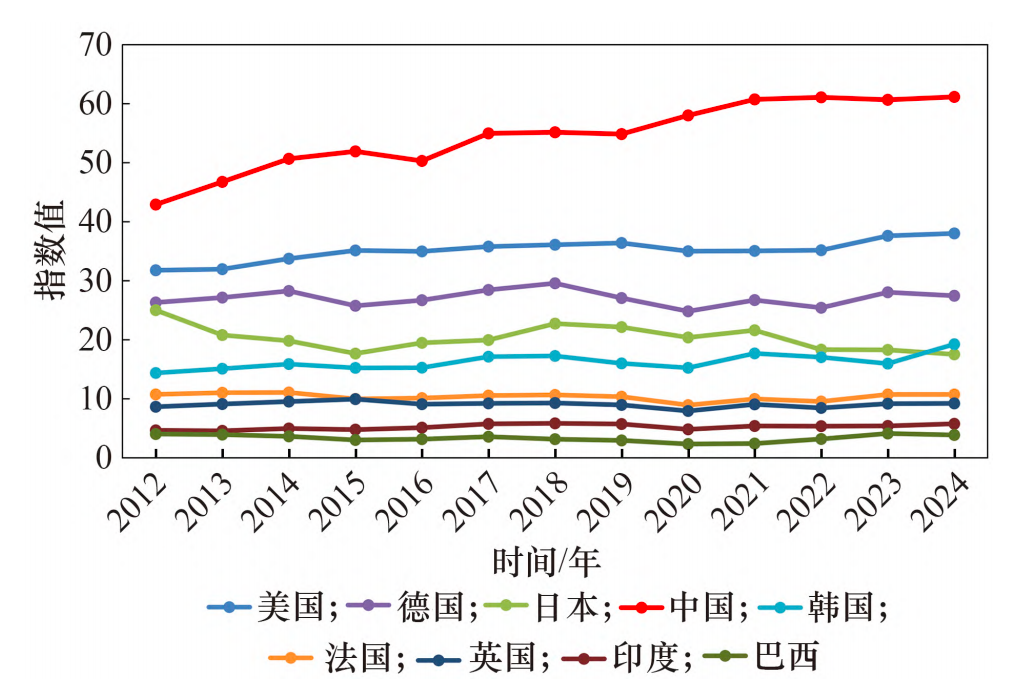 制造强国发展指数的变动见证了我国制造强国建设进程,形成了具有中国特色的制造强国建设模式。2012-2024年,我国“规模发展”分项数值由42.93提升至61.15,无论是指数值增幅还是指数绝对值均领先于其他8个国家(见图2)。从具体指标看,我国制造业增加值自2010年跃居世界第一以来持续“领跑”,至2024年已超越美国、德国、日本、英国等主要经济体的总和。同时,我国制造业占全球的比重从2012年的22.5%提升至2024年的27.7%,稳居世界首位。出口优势同样显著,我国已连续多年保持全球货物贸易第一大出口国地位,制造业出口全球份额从15.52%增长到18.74%。