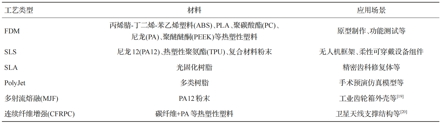 当前主流的3D 打印技术工艺主要有熔融沉积成型(FDM)、选择性激光烧结(SLS)、立体光刻(SLA)、材料喷射(PolyJet)等。图2 为3D 打印主要工艺技术原理。不同的工艺之间所需要的打印材料和应用场景也并不相同。表1为3D打印主要材料及应用场景。