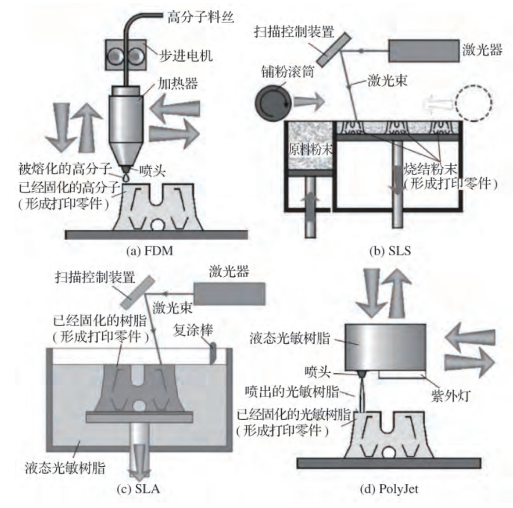 从图2a 可以看出,FDM 工艺的核心原理在于使用热塑性高分子线材,通过精密供料系统将原料输送至加热装置,材料在高温作用下转变为熔融态后,由数控系统驱动喷头沿预设轨迹进行分层堆积。从图2b 可以看出,相较于FDM 技术,SLS 工艺主要采用聚合物粉末作为成型介质。其设备运行流程可概括为:供粉机构通过自动铺粉装置在成型基板上形成均匀粉层;高精度激光束根据截面数据选择性烧结粉末颗粒;完成单层加工后平台按设定参数下移,循环进行铺粉-烧结作业直至构件成型。从图2c 可以看出,SLA 工艺基于光聚合原理,选用液态光敏树脂作为基础材料。设备运行机制包含以下阶段:首先通过三维模型切片处理生成扫描路径数据;随后紫外激光束按预定轨迹对树脂液面进行逐点固化;每完成单层固化后,升降平台带动已成型部分下移特定层厚,待新鲜树脂覆盖表面后继续下一层固化作业。从图2d 可以看出,PolyJet 技术虽同样采用光敏树脂,但其工作机制有别于传统SLA 工艺。该技术通过多喷嘴阵列将液态光敏高分子材料精确喷射至成型区域,随即采用紫外光源进行即时固化。