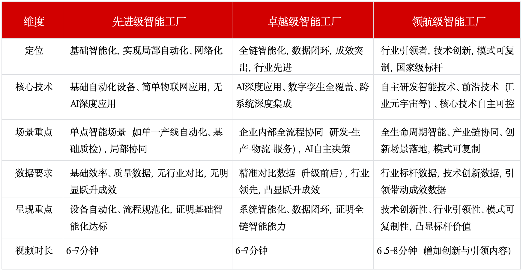2. 重点突出:核心场景(AI、数字孪生、智能决策)时长占比不低于50%,清晰凸显卓越级智能工厂的核心能力,与先进级形成明显差异。