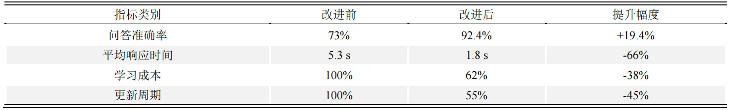 实践表明,影响大模型应用效果的关键因素并非模型规模,而是知识体系质量。针对行业制度文档复杂、语义密度高的特点,应构建“RAG+知识图谱”的统一知识引擎,并采用混合检索策略(BM25+向量检索)。Karpukhin.在DPR实验中表明,结合稀疏与密集检索可提升Recall@10约10%~20%;MA的HybridRetrieval研究报告中,混合索引相较单一检索平均提升17.6%。调研结果显示,该策略可提升检索召回率约18%,问答准确率稳定提升至90%以上。同时,应建立“RAG反馈闭环”,通过用户交互数据持续优化知识质量。