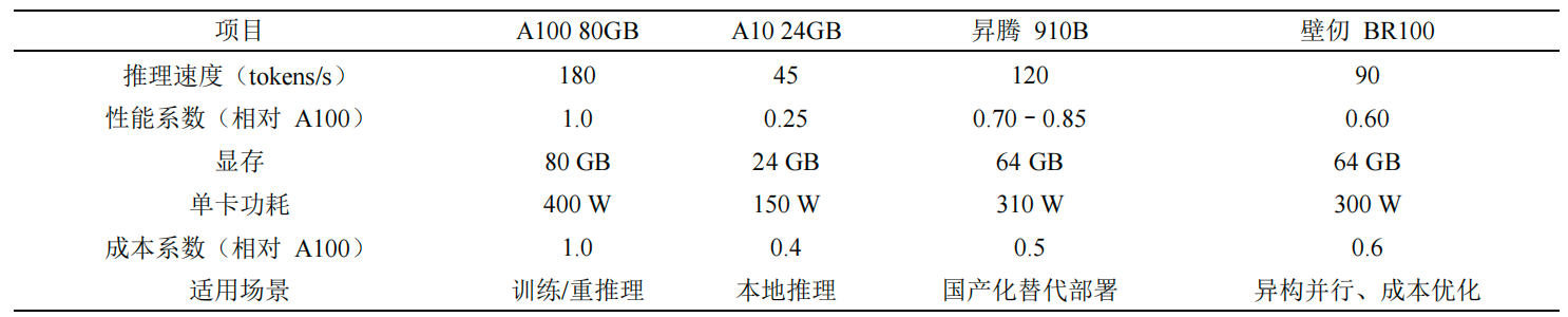 算力体系是大模型落地的基础约束条件。当前行业普遍依赖A10、A100等GPU资源,但国产算力已具备可替代能力。调研表明:昇腾910B、壁仞BR100等国产芯片在推理性能上已达到国际主流水平的70%~85%,在成本与能耗方面具有明显优势,70B模型推理场景下综合成本约为A100的50%。