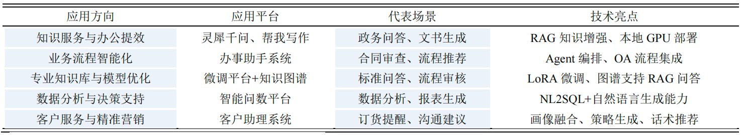 在行业统筹部署与企业自主探索的双轮驱动下,大模型应用已在多个业务领域实现实质性落地,形成了多场景、多层级的实践格局(见表4)。相关应用覆盖办公提效、流程智能、知识管理、数据决策、精准营销与教育培训等核心领域,初步验证了大模型在行业中的可用性、可扩展性与可复制性。总体来看,行业大模型应用已从“单点工具应用”演进为“业务能力嵌入”,并呈现出由局部提效向系统优化转变的趋势。