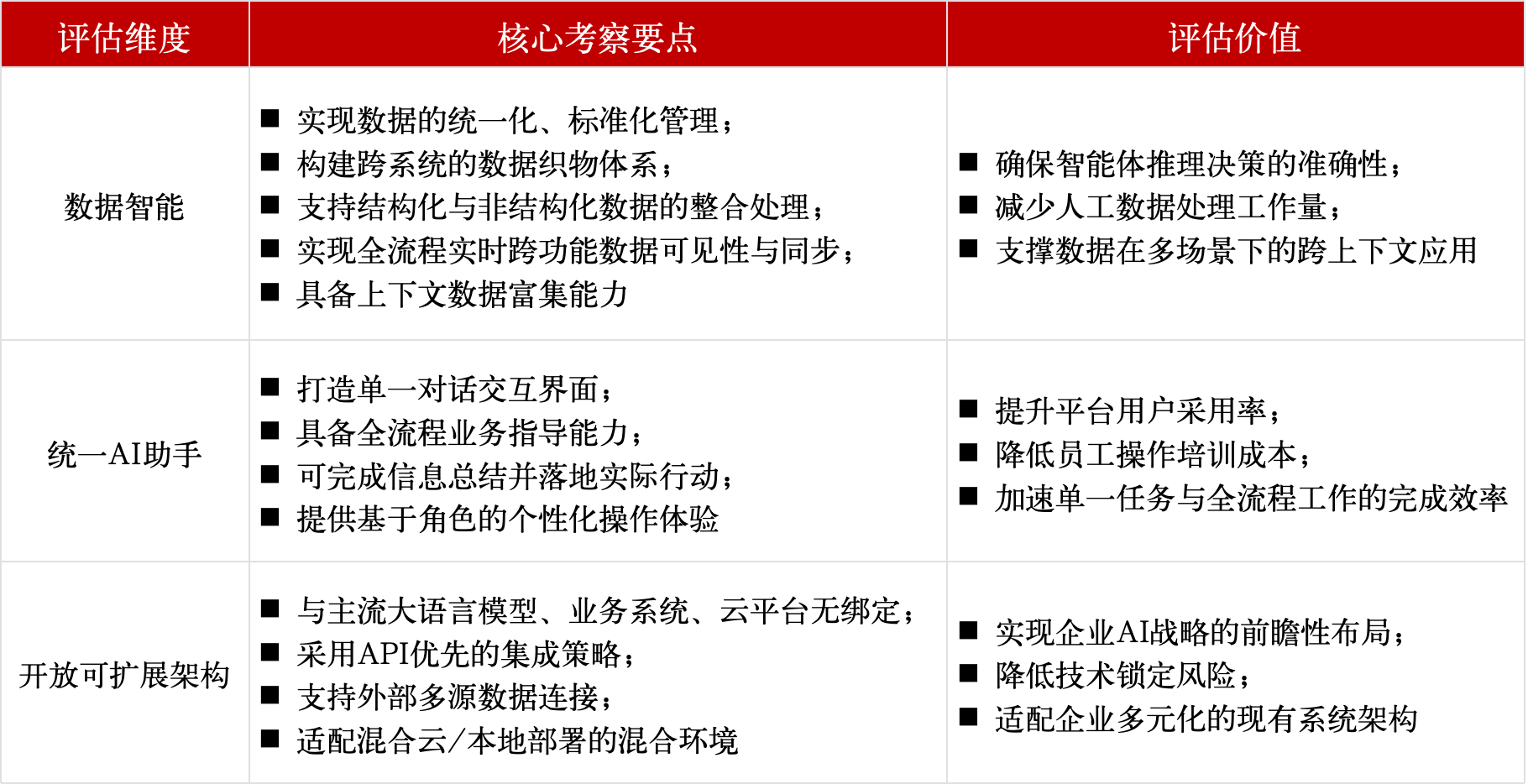 企业选择智能体AI平台时,需聚焦核心评估领域,明确各领域的考察重点与核心价值导向,以下为关键评估维度及对应的具体要求: