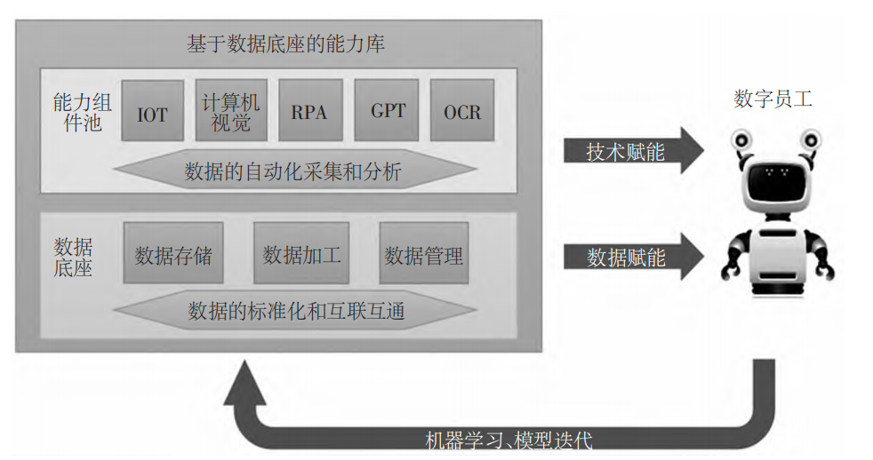 公司在用供应链管理系统一直存在与ERP、财务系统数据割裂的问题。为解决数据集成问题,公司决定开发数据底座重塑数据架构。先是定义了200+数据接口规范,支持API、文件传输多模式集成,实现了接口的标准化;然后运用Trifacta等工具清洗历史数据,使历史数据错误率从12%降至3%,进一步实现数据的标准化并提高数据一致性。通过数据底座实现标准数据关联共享后,线上业务处理时间平均缩短至8min以内,工作协同效率大大提升。数据底座-数字员工示意图如图3所示。