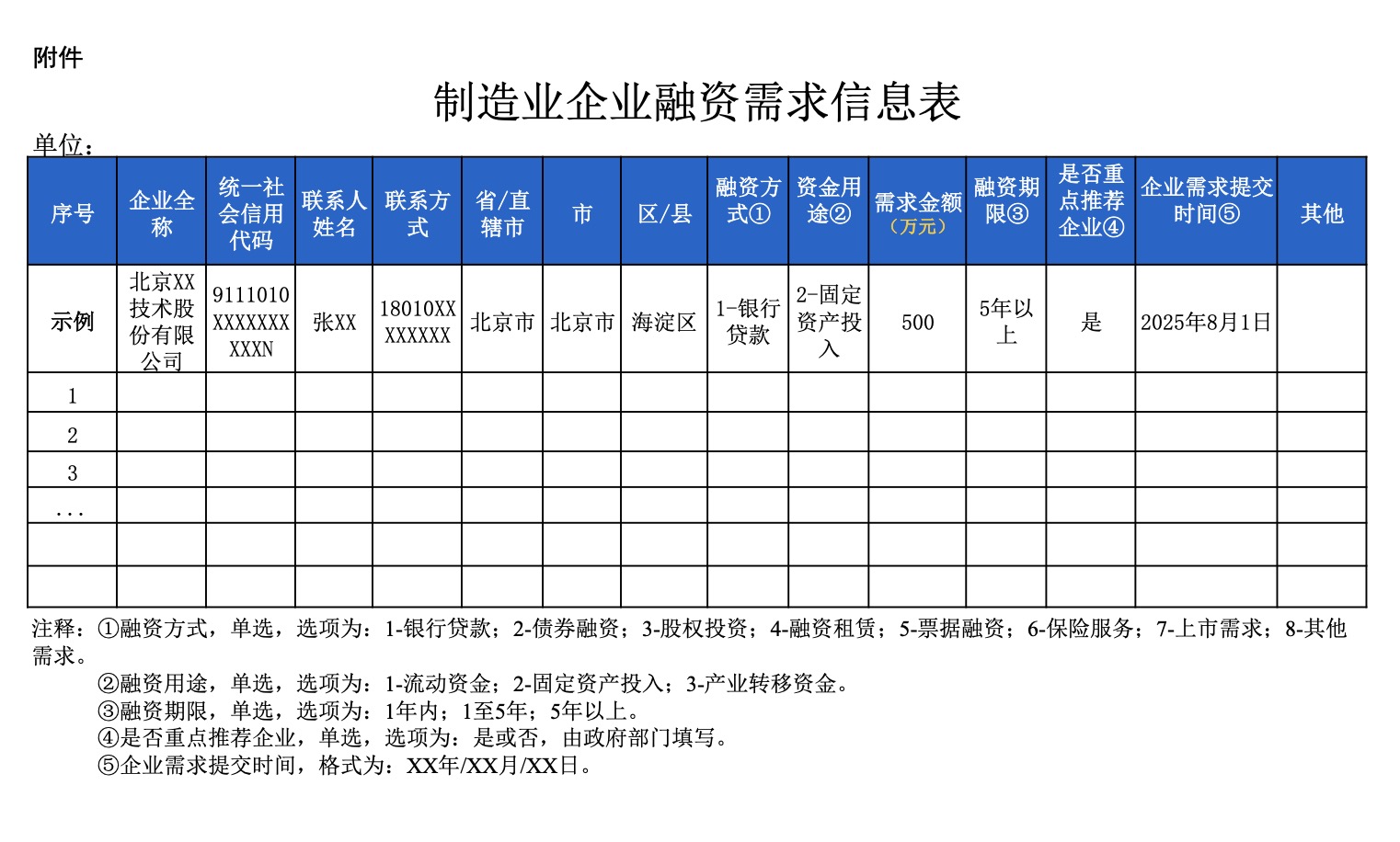(二)因敏感信息等原因不便线上填报的,可由省级工业和信息化主管部门、相关行业协会汇总本地区、本行业制造业企业融资需求信息表(见附件),以安全保密方式报送工业和信息化部(财务司)。